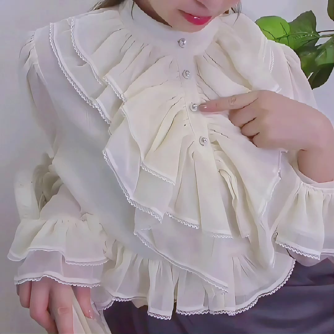 ふわっと軽やかなシフォン生地に、たっぷり重ねたフリルが目を惹くときめきブラウス!