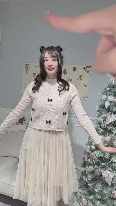 リボンがポイントのニットベストと、ふわっと広がるチュールワンピースの組み合わせは、甘さと大人っぽさのバランスが絶妙。
