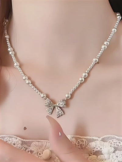 きらめくビジューがあしらわれたゴールドのリボンと、上品に艶めくパールが織りなすロマンティックなネックレス。